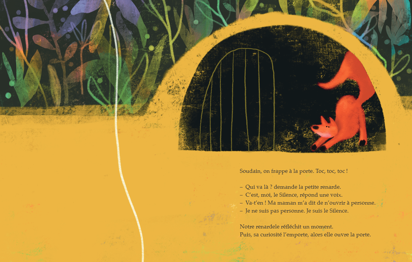 작은 여우와 방문자인 침묵은 — 사실은 아이가 초대한 손님이다— 순간을 함께 즐긴다. 함께 간식을 나누어 먹으니 긴장이 풀린다. 두려움은 온데 간데 없다. 작은 여우는 자기는 춤추는 것을 좋아한다며 함께 춤추는 것을 제안한다. 음악을 틀으려 할 때, 침묵은 작은 여우를 말린다. 음악이 흘러나오면 난 가야 해, 라며.