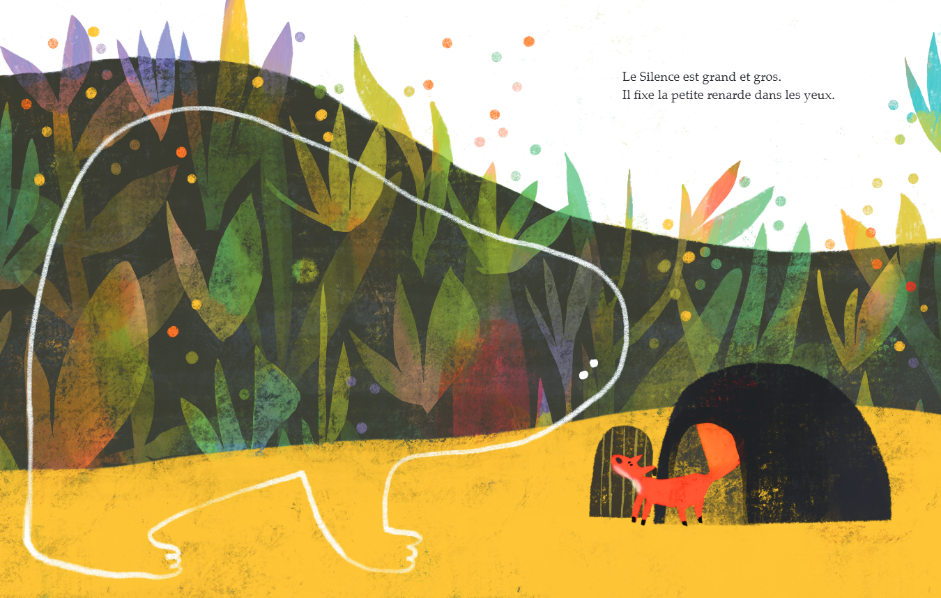 침묵을 하나의 신비로운 인물로 형상화해 작은 여우의 집을 가득 채우는 모습, 그리고 그 존재를 클로즈업한 그림은 독자 역시 자연스럽게 자기 안으로 잠시 들어가는 경험을 하게 한다.