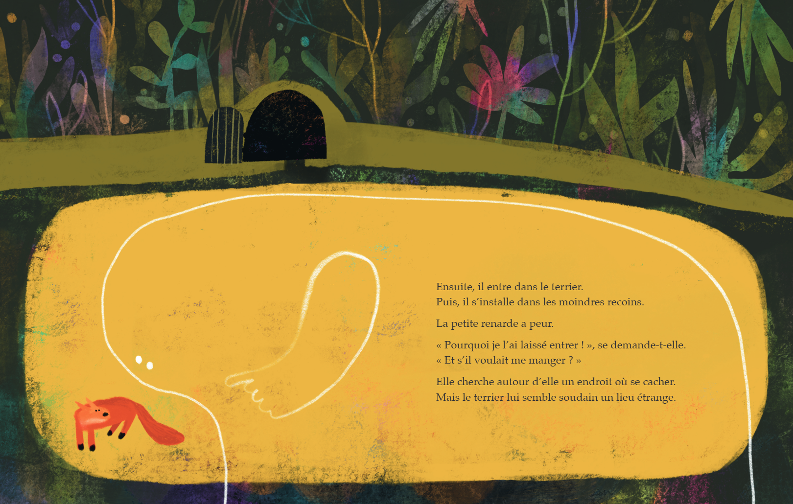 작은 여우는 문 너머 낯선 존재에게 “엄마가 아무에게도 문 열어주지 말라고 했어요”하고 말하지만, 사실 작은 여우의 마음 문은 이미 열려있다. 문 너머에서 “나는 사람이 아니야”하는 정말 듣고 싶은 목소리를 듣기 때문이다.